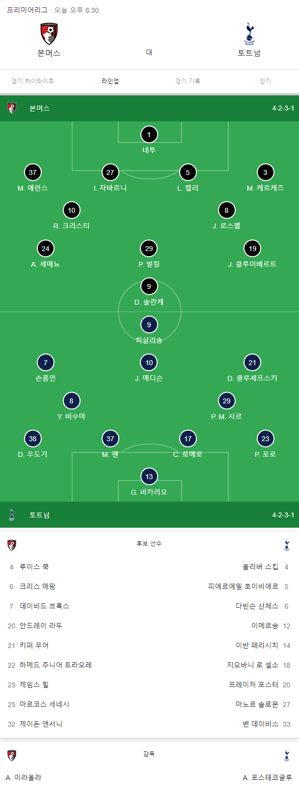 다음은 오늘의 라인업입니다. 오늘도 손흥민 선수는 왼쪽 윙으로 선발 출전이네요. 손흥민 선수의 멋진 활약을 기대하며 오늘의 글 마치겠습니다.